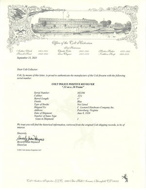 This Colt Police Positive Revolver was shipped to the C. Leonard Hardware Company Inc. of Petersburg Virginia on June 8th, 1939 in a single gun shipment. It features a 4" barrel and a factory blue finish.