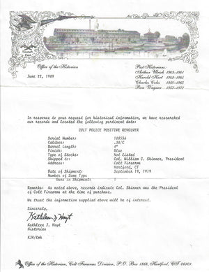 This Colt Police Positive was shipped to Col. William C. Skinner of Colt's Patent Fire Arms Mfg. Company in Hartford Connecticut on September 19th, 1919.  The factory letter remarks state: As noted above, records indiciate Col. Skinner was the President of Colt Firearms at the time of Purchase.