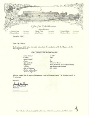 This Colt Police Positive Revolver was shipped to the Baker, Hamilton, and Pacific Company on July 9th, 1928 in a single gun shipment.  It notes on the factory letter that the stocks were checkered wood. This pistol was manufactured right near the changeover between wood and rubber grips.