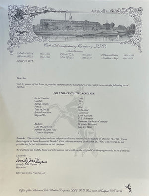 This Colt Police Positive Revolver was shipped to the Loan Account of F.S. Robertson of the Simmons Hardware Company in St. Louis, Missouri on May 25th, 1906 in a single gun shipment.