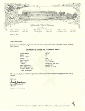 This Colt Service Model Ace was shipped to John J. Tobler of Union City, New Jersey on July 30th, 1940. It was manufactured on October 25th, 1938.