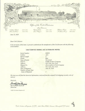This Colt Service Model Ace was sold to the Griffin & Howe Company in New York, New York. It was shipped Abercrombie & Fitch Company in New York, New York on June 20th, 1939 in a single gun shipment.