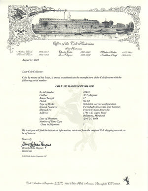 This Colt 3-5-7 Magnum Revolver was shipped to Fenwick's Gun Annex Inc. at 1744 A.E. Jappa Road, Baltimore, Maryland on April 24th, 1964. It was part of a 5 gun shipment.