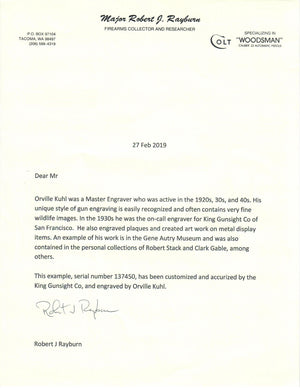 The letter reads: "Orville Kuhl was a Master Engraver who was active in the 1920s, 30s, and 40s. His unique style of gun engraving is easily recognized and often contains very fine wildlife images. In the 1930s he was the on-call engraver for King Gunsight Co of San Francisco. He also engraved plaques and created art work on metal display items. An example of his work is in the Gene Autry Museum and was also contained in the personal collections of Robert Stack and Clark Gable, among others.