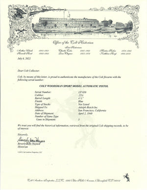 This Colt Woodsman Sport was produced in 1940. It's currently been modified with a Colt King Super Target front sight and a King adjustable rear sight. It is accompanied by a letter from Major Robert J. Rayburn who is the the authority on the Colt Woodsman pistols.