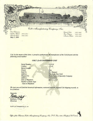 This Colt .22-45 Conversion Unit was shipped April 5th, 1940 to the Sharp Paper & Specialty Company of New York, New York. It was ordered by W.J. Bennett.