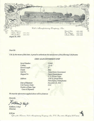 This Colt Conversion Unit was sold to the United States Government.  It was Shipped on December 23rd, 1942 to the U.S. Marine Corps at 1100 So. Broad Street in Philadelphia, PA on Colt's factory order 241 in a 15 gun shipment.