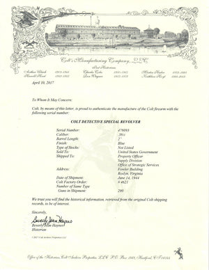 This Colt Detective Special was shipped to the Property Officer, Supply Division of the Office of Strategic Services (OSS) at the Fowler Building, in Roslyn, Virginia on June 14th, 1944 in a 290 gun shipment. This was on Colt Factory Order #4621.