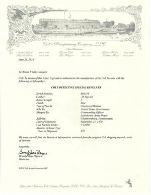 This Colt Detective Special was shipped September 21st, 1970 to the Commanding Officer at the Letterkenny Army Depot in Chambersburg, Pennsylvania. It was on Colt factory order #12080 in a 937 gun shipment. The factory letter states this was sold the the United States Government.