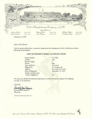 This Colt Government Model was shipped September 15th, 1934 to A.F. Stoeger Inc. of New York, New York in a 30 gun shipment. It is finished in colts fine brushed blue and has the factory checkered walnuts stocks.