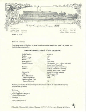 Colt opted to to use these pistols to fill an order placed by the Norwegian Navy, which was in exile in Nova Scotia after Norway was overrun by the Germans. This order consisted of just 200 pistols in total and the bulk of the order were to be placed aboard Norwegian whaling vessels that had been outfitted to function as shipping convoy escorts.