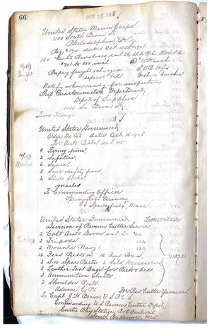 Attached is a copy of Colt's Order Ledgers showing the order from the United States Marine Corps had requested 100 pistols on October 15th, 1908. The price per pistol was $11.00 each at the time. They had estimated a 35 day lead time and ended shipping the pistols on November 14th, 1908.