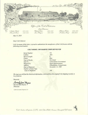 This Colt Model 1905 Marine Corps Revolver was sold to the United States Government and shipped to the Depot Quartermaster in Philadelphia, Pennsylvania on November 14th, 1908 in a 100 gun shipment.