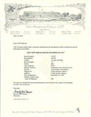 This Colt M1917 Revolver was shipped on September 19th, 1918 to the Camp Ordnance Officer at Camp Funston, Kansas. It has a corse brushed blue finish with wood grips. Special features on the factory letter indicate that it was finished with a lanyard swivel. The number on the butt of the pistol is 105148.