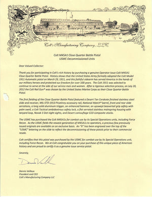 "Thank you for participating in Colt's rich history by purchasing a genuine Operator Issue Colt M45Al Close Quarter Battle Pistol. History shows that the United States Army formally adopted the Colt Model 1911 Automatic pistol on. March 29, 1911, and this faithful sidearm has served America in the hands of our military heroes and protected our freedom for over 100 years. The Colt 1911 was selected to continue to serve at the side of our service men and women. After a rigorous selection process, on July 20, 2012 the Colt Rail Gun was chosen by the United States Marine Corps as their Close Quarter Battle Pistol.