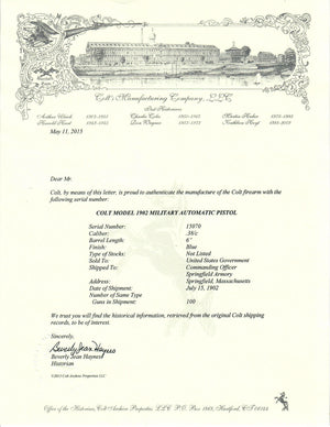 This Colt 1902 Military was sold to the United States Government and shipped to the Commanding Officer at the Springfield Armory in Springfield Massachusetts on July 15th, 1902.  The US Government would order 200 of these pistols for testing in 1902.