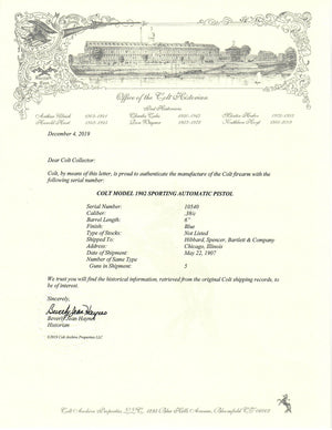 This Colt 1902 Sporting was shipped to Hibbard, Spencer, Bartlett & Company in Chicago, Illinois on May 22nd, 1907 in a 5 gun shipment.