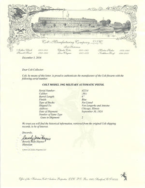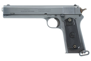 This Colt 1902 Military was shipped to the Von Lengerke and Antoine of Chicago, Illinois on September 30th, 1924 in a 2 gun shipment. It features Colt's fine brushed blue finish with hard rubber grips. This is a later production 1902 military with the case colored spur hammer.