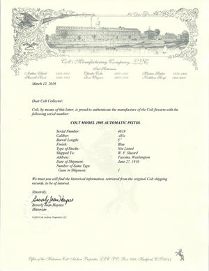 his Colt Model 1905 was shipped on June 27th, 1910 to W.F. Sheard of Tacoma Washington.