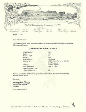 This Colt Model 1905 was shipped to Colt's Patent Fire-Arms Mfg. Co's London Agency in London, England on May 10th, 1906 in a 20 gun shipment.