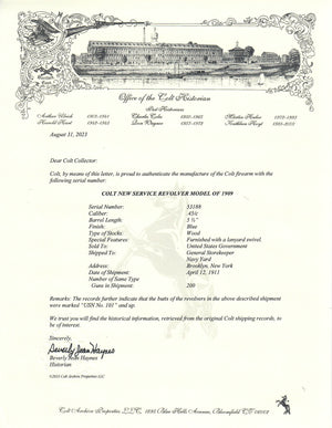 This Colt New Service Revolver Model of 1909 or M1909 was shipped to the General Storekeeper, Navy Yard in Brooklyn, New York on April 12th, 1911. It lists the total number of guns in shipment was 200. Special features" Furnished with a lanyard swivel".