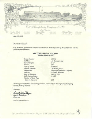This Colt New Service Civilian Model 1917 was shipped to the Shapleigh Hardware Company in St. Louis, Missouri on July 28th, 1932 in a 500 gun shipment.  The factory letter notes a special notation of "War time finish".  This revolver has the factory walnut checkered grips.