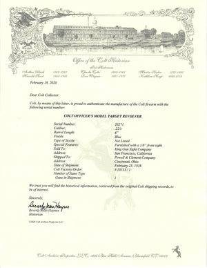 This Colt Officer's Model Target Revolver was sold to the King Gun Sight Company in San Francisco, California. It was shipped to the Powell & Clement Company in Cincinnati, Ohio on February 25th, 1938 in a single gun shipment. It was on Colt Factory Order #10133/1.