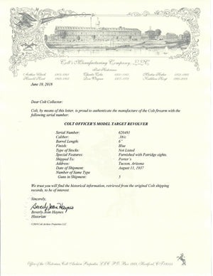 This Colt Officer's Model Target was shipped to Porter's of Tucson, Arizona on August 11th, 1937 in a 5 gun shipment.  Special features note that this Officer's Model was finished with partridge sights.