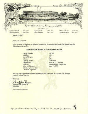 This Colt Service Model Ace was shipped to Captain Edward C. Crossman of Santa Monica, California on June 17th, 1938 in a single gun shipment.  A Colt  Service Model Ace that was sold commercially is rare, as the majority of these pistols were sold to the US Military for training purposes.