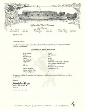 This 2.5" Colt Python was shipped to Northeast Gun & Supply Company, D/B/A Ivanhoe Sports Center at Main Street, Watertown, Massachusetts.  It was in a 4 gun shipment on December 12th, 1972.