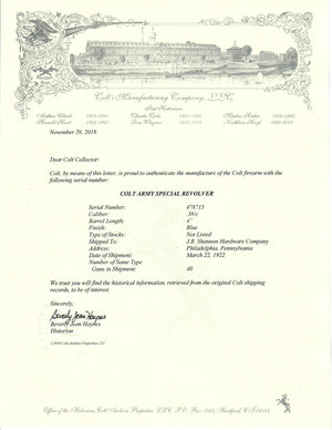 This Colt Army Special shipped to the J.B Shannon Hardware Company of Philadelphia, Pennsylvania on March 22nd, 1922 in a 40 gun shipment.