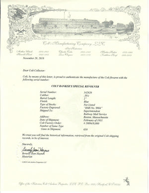 This Colt Bankers Special Revolver was shipped February 1931 in a 650 gun shipment.  The letter reads Factory Engraved: "RMS No. 9804" as is seen on the butt and the backstrap of the revolver.