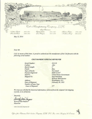 This Colt Bankers Special Revolver was shipped February 26th, 1931 to the Railway Mail Service Superintendent in Washington, D.C. in a 577 gun shipment. The letter reads Factory Engraved: "RMS No. 11447" as is seen on the butt of this revolver.