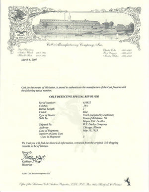 This Colt Detective Special was shipped to the Mayor N.H. Deshler of the Town of Belvidere, New Jersey on May 10th, 1933 in a 3 gun shipment.