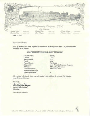 This Colt Officer's Model Target was shipped to the John Pritzlaff Hardware Company in Milwaukee, Wisconsin on March 16th, 1928 in a single gun shipment.
