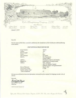This Colt Official Police was Sold to the War Department, Finance Officer in Washington, DC.  It was shipped to the Southwestern Proving Grounds in Hope Arkansas.  Attn: Captian H.B. Bishop, Ordnance Depot, Post Quartermaster on May 6th, 1942 in a 55 gun shipment.