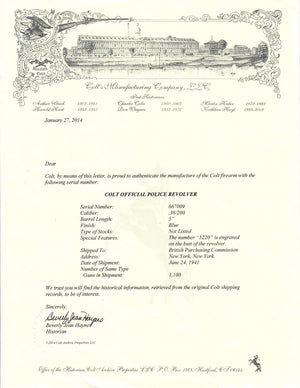 This Colt Official Police was shipped to the British Purchasing Commission in New York, New York on June 24th, 1941 in a 1,100 gun shipment. Special features state: The number "5220" is engraved on the butt of the revolver.