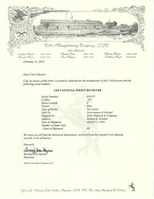 This Colt Official Police was sold to the Government of Iceland and shipped to the John Olafsson & Company in Reykjavik, Iceland on March 21st, 1940 in an 80 gun shipment.