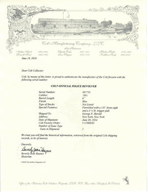 This 6" Colt Official Police was shipped to George F. Herold in New York, New York on June 20th, 1934 in a single gun shipment. Special features indicate that this pistol was furnished with a 1/8" front sight and a 3 1/2lb. trigger pull.