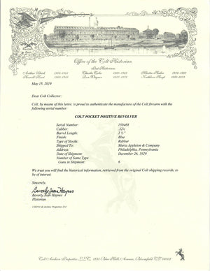 This Colt Pocket Positive revolver has a 2 1/2" barrel and is blued with rubber grips. It was shipped to the Murta Appleton & Company of Philadelphia, Pennsylvania on December 26th, 1926 in a 6 gun shipment.