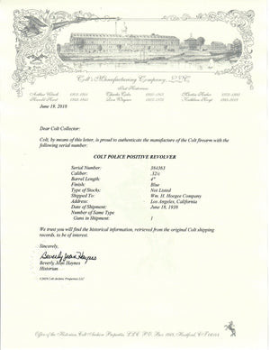 This Colt Police Positive was shipped to the Wm. H. Hoegee Company of Lost Angeles, California on June 18th, 1938 in a single gun shipment.  The revolver is blue with checkered walnut stocks.