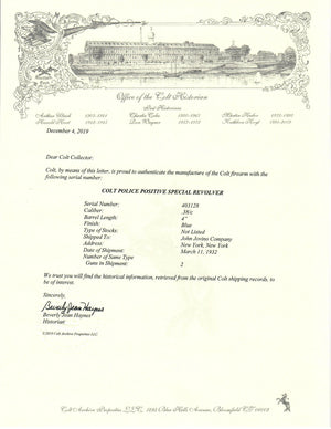 This Colt Police Positive was shipped to the John Jovino Company in New York, New York on March 11th, 1932 in a 2 gun shipment. It is chambered in .38 with a 4" barrel and was factory finished in blue.