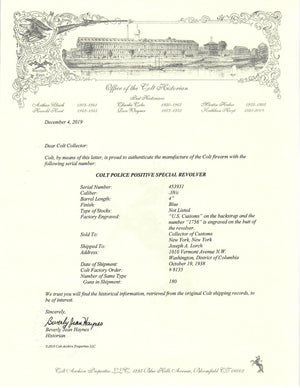 This Colt Police Positive was shipped to Joseph A. Lorch at 1010 Vermont Avenue N.W. Washington, District of Columbia on October 19th, 1938. It was on Colt Factory order #8135 in a 180 gun shipment. The Colt factory letter also states Factory Engraved: "U.S. Customs" on the backstrap and the number "1756" is engraved on the butt of the revolver. It was sold to the Collector of Customs in New York, New York.