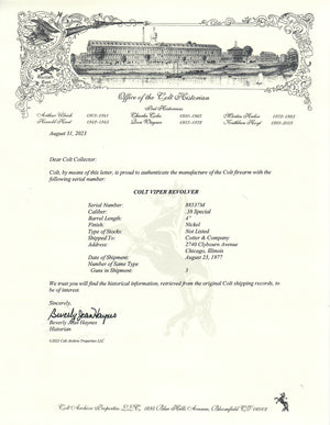 This Colt Viper was shipped August 23rd, 1977 in a 3 gun shipment. It was shipped to Cotter & Company of 2740 Clybourn Avenue, in Chicago, Illinois.