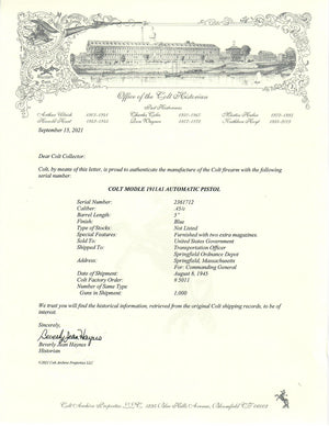 This Colt M1911A1 was shipped on August 8th, 1945 on Colt Factory Order #5011. It was sold to the United States Government and shipped to the Transportation Officer at the Springfield Ordnance Depot in Springfield Massachusetts for the Commanding General. It was part of a 1,000 gun shipment.