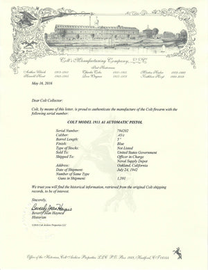 This Colt M1911A1 was shipped to the Officer in Charge at the Naval Supply Depot in Oakland, California on July 24th, 1942 in a 1,591 gun shipment. It's finish on the letter is blue but by this point in time production had switched over to parkerizing.
