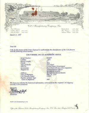 This Colt M1911A1 was shipped on May 24th, 1943 to the Transportation Officer at Springfield Armory. It was on Colt Factory Order # 2285 as part of a 800 gun shipment.