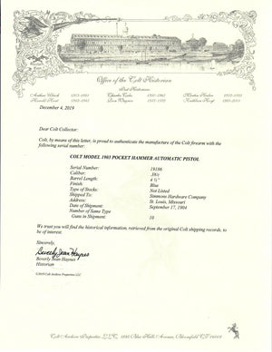 This Colt 1903 Pocket Hammer was shipped to the Simmons Hardware Company of St. Louis, Missouri on September 17th, 1904 in a 10 gun shipment. It is finished in Colt's High Polish blue and retains fire blue on the small parts. It has plunge milled serrations on the slide and the early style hand checkered round hammer.