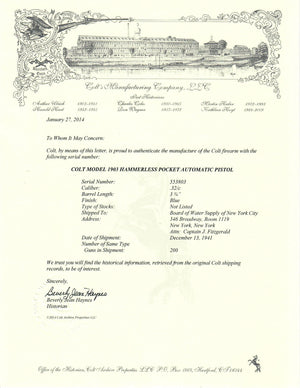 This Colt 1903 Pocket Auto shipped to the Board of Water Supply of New York City at 346 Broadway, Room 119 New York, New York Attn Captian J. Fitzgerald on December 13th, 1941 in a 200 gun shipment.