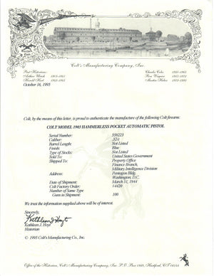 This Colt 1903 was shipped to the Property Office, Finance Branch of the Military Intelligence Division, Pentagon Bldg. in Washington, D.C. on March 31st, 1944. This was on Colt Factory Order #4420 in a 100 gun shipment.